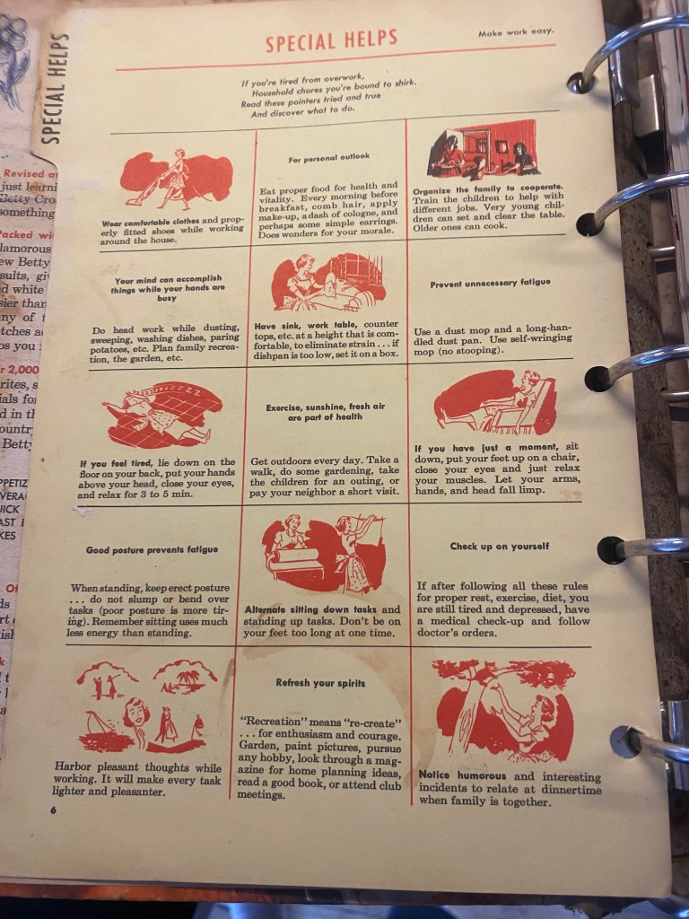 - Lay down on the floor. About a year ago, my amazing therapist told me that she often goes outside to lie on her deck between appointments as a way to clear her head and rest. It was funny to me because I had long joked with my former work wife that all my yoga was really just my excuse for a chance to lie down on the floor. Since then, messages of the power of lying on the floor keep coming to me, like this photo of the opening pages of a 1950’s Betty Crocker Cookbook or in this NYT challenge.