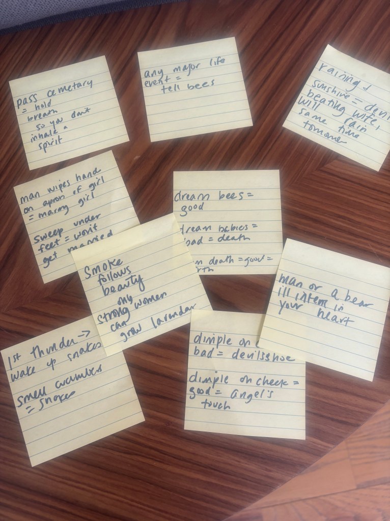 I started listening to this podcast Grow Where You’re At in which two Appalachian female homesteaders with delightful accents talk about farming and Appalachian culture. In one of their episodes, they talk about folklore and old sayings. The episode captivated me and as I listened, I started taking notes on post-its.
