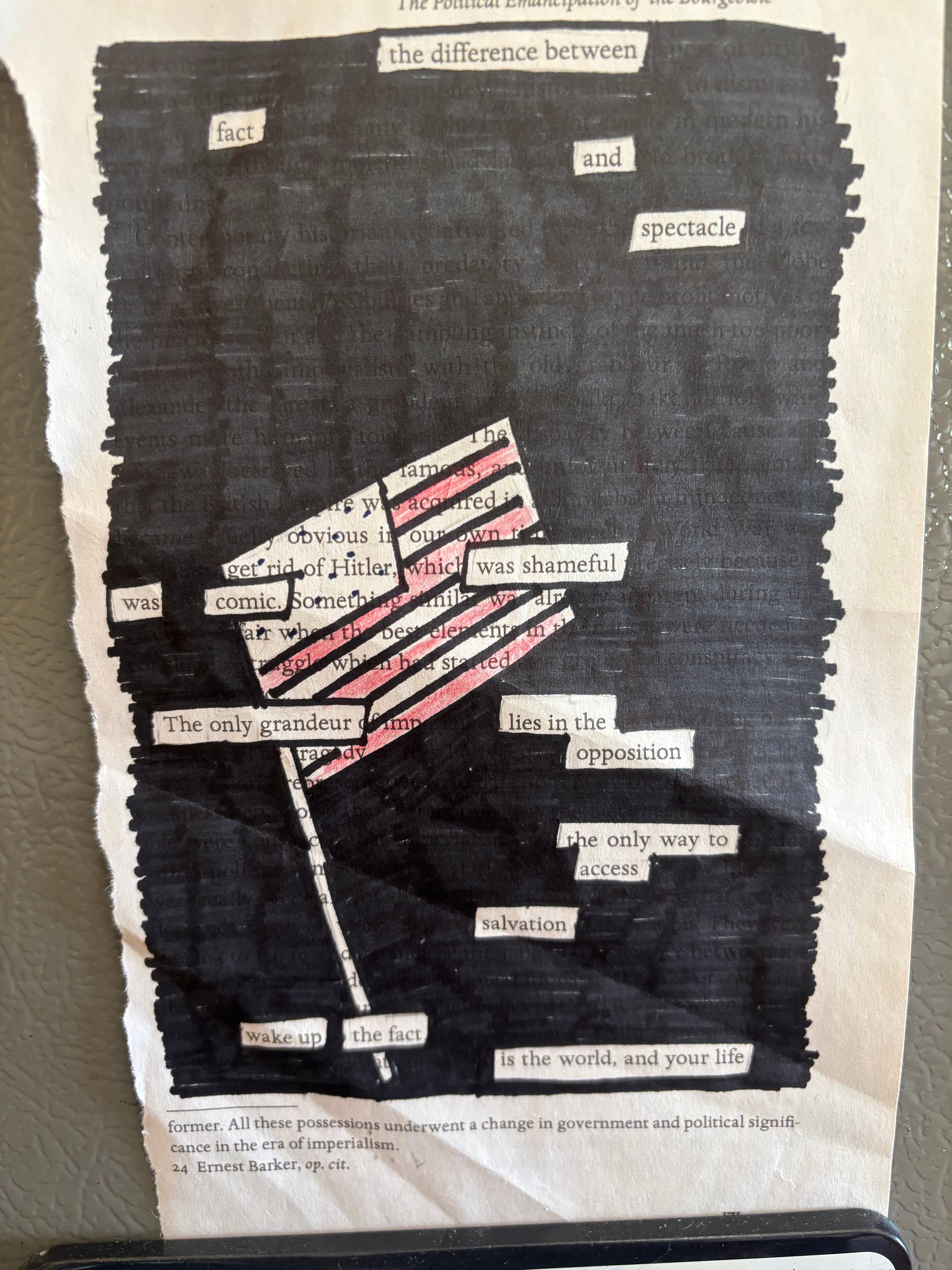 So, stay tuned! Before I sign off, let me invite you to comment on this post or share it with someone else if you think they might like it. I spent the better part of an afternoon writing it, all the while haunted by the sense that I should be grading or writing a poem or walking the dog, or even doing this other project that I’ll sign off with below: turning Hannah Arendt’s The Origins of Totalitarianism into blackout poems–because why not?