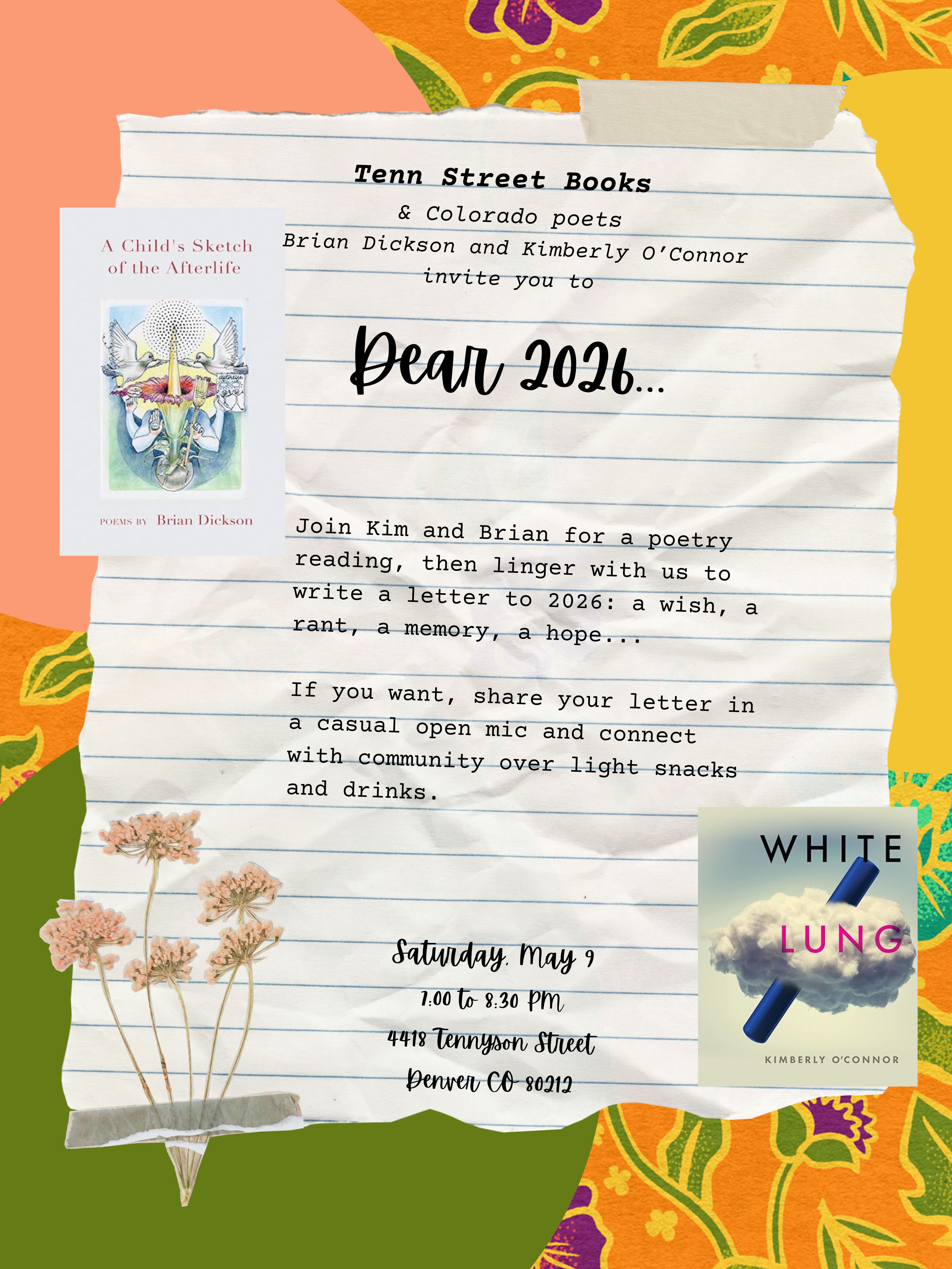 In the meantime, though, I’m reading with Brain Dickson at Tenn Street Books on May 9, and we’re inviting audience members to write a bit and share, too! What do you have to say to 2026? If you’re in the Denver area, come hang out!